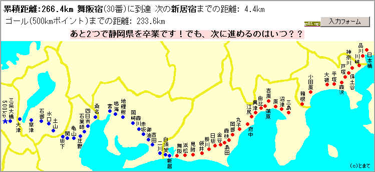 go53.cgiはウォーキング、ジョギング、スイミングなどに継続的に取り組もうとされる方向けに、一日に進んだ距離を入力することにより 累積距離を計算して東海道53次の地図上に表示するためのCGIです。ビジュアルに表示することにより継続への励みになるのではないか ということで作ってみました。