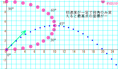 仰角一定、初速度の大きさのみを変えたときの極点をグラフにしてみたら
