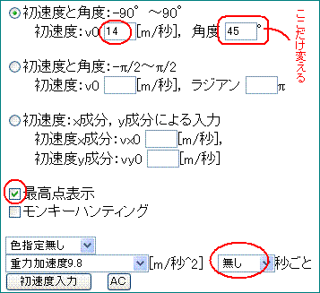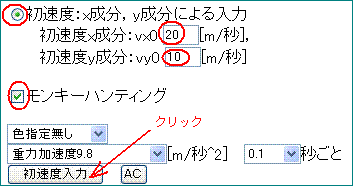 そして、モンキーハンティングのチェックボックスを入れて、[初速度入力]ボタンをクリック。