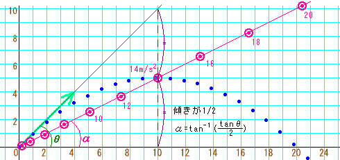 こっちは傾きがvy0/2vx0の直線のグラフになりますね。但し、あくまでも傾きが初速度の半分ということで、角度が半分なわけではありません。角度を求める式は、三角関数の逆関数α=tan-1(vy0/2vx0)になります。