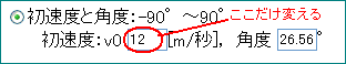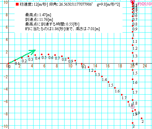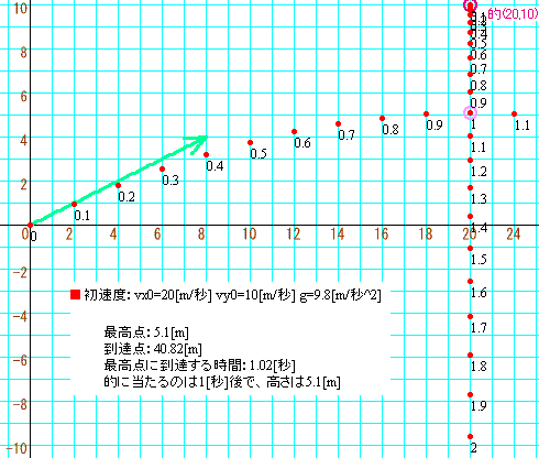 的の座標は(20[m],10[m])の位置なので、その位置に向けて斜方投射するには、vx0:vy0=2:1の割合にします。仮に、下の数値を入力してみましょう。
