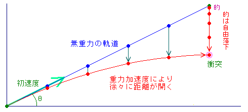 ところが、重力があるので、的も、斜方投射された物体も、時々刻々と予定の位置よりも