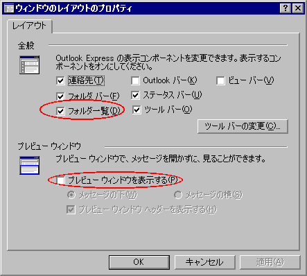 まず、OutlookExpressを立ち上げて、[表示]-[レイアウト]を選択、[フォルダ一覧]の表示をチェックしておいて下さい。