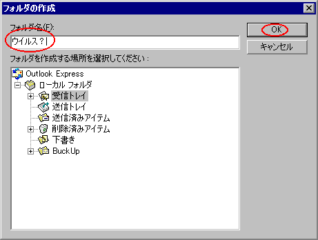 (どの場所にどんな名前のフォルダを作っても別に良いのですが、受信トレイ以下ですと受信ということが分かりやすいですし、[ウイルス?]という名前のフォルダを開く時にはちょっと緊張するので良い名前なのではないかと…笑)