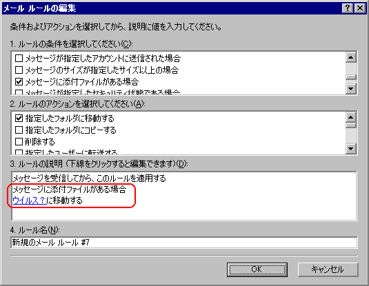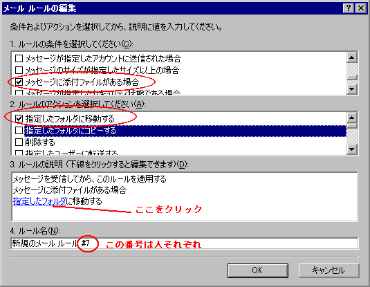 出てきた[メールルールの編集]ダイアローグ上で、[メッセージに添付ファイルが有る場合][指定したフォルダにどうする]にチェックを入れます。