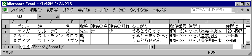- EXCELを開いて、下記のような住所録シートを作って保存しておく。フィールド名の“姓、名、郵便番号、住所_1、住所_2”の5項目は