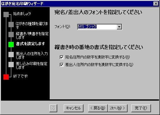 フォントの指定は後で変更できるのでこのまま進みましょう。宛名を漢数字変換は便利なのでお勧めです。でも、これも後で変更可能です。[次へ]をクリック。