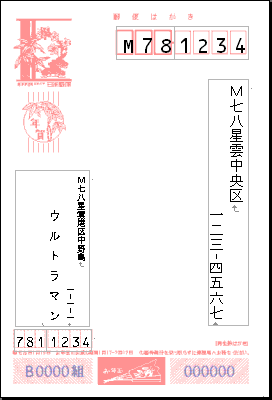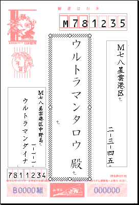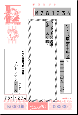 宛名が連名で無い場合でも余り不自然にならないように宛名の位置や幅を調整します。また、住所や差出人のフォントサイズ、スタイルもお好みのものへ変更します。