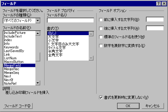 差出人苗字の下の部分をクリックしてカーソルを置いた状態で[挿入]-[フィールド]をクリックし、[フィールドの名前]を“MergeField”にして[OK]をクリック。