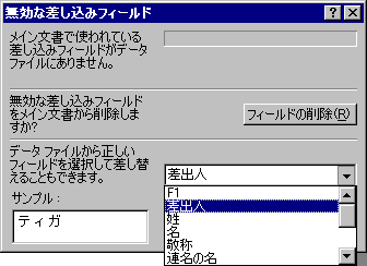 無効な差込フィールドのダイアローグにて、必要なフィールド名(この場合は、差出人)を選択して[OK]をクリック。