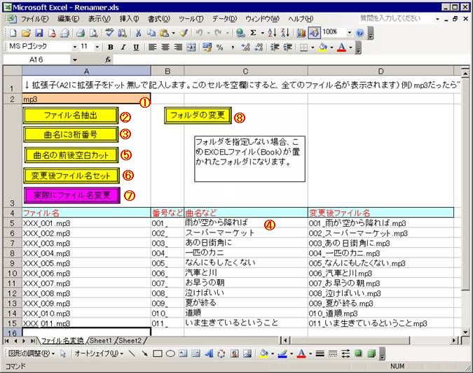 WindowsXP上でこれらのファイル名を曲名に直すのは、ファイルのアイコンを右クリックして[名前の変更]をクリックして、曲名を打ち直すことになりますが、これは不便なので、EXCELのマクロを使って、一括してファイル名を変更する方法を考えました。