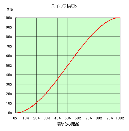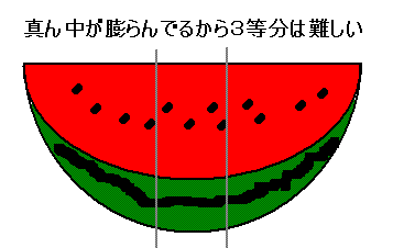 が甘みも分散されて正しい切り方な訳ですが、難しいものですから、スイカを横にして垂直に切っていく様になりがちなのです。そこで、あの曲面を具備する立体を正しく3等分するには、どのような配率で切ったら良いのだろうか、と、ずぅぅっと長年気になっていた訳です(笑)。