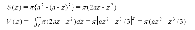 - 緑色の球体の切れ端の体積VはS(z)を、zについて0→zまで積分してあげることによって求まります。