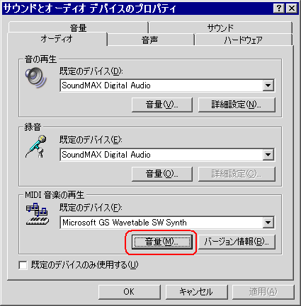 - MIDI音楽の再生で[音量]をクリック