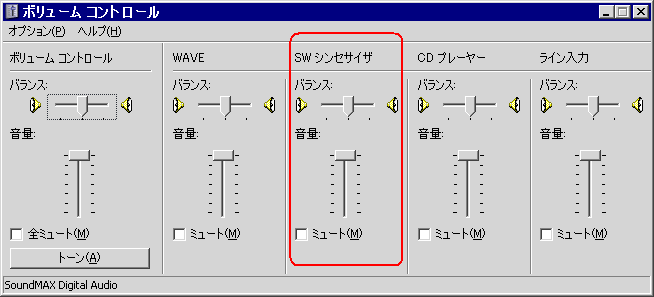 - [ボリュームコントロール]ー[SWシンセサイザ]のボリュームをMAXまで上げてから閉じる
